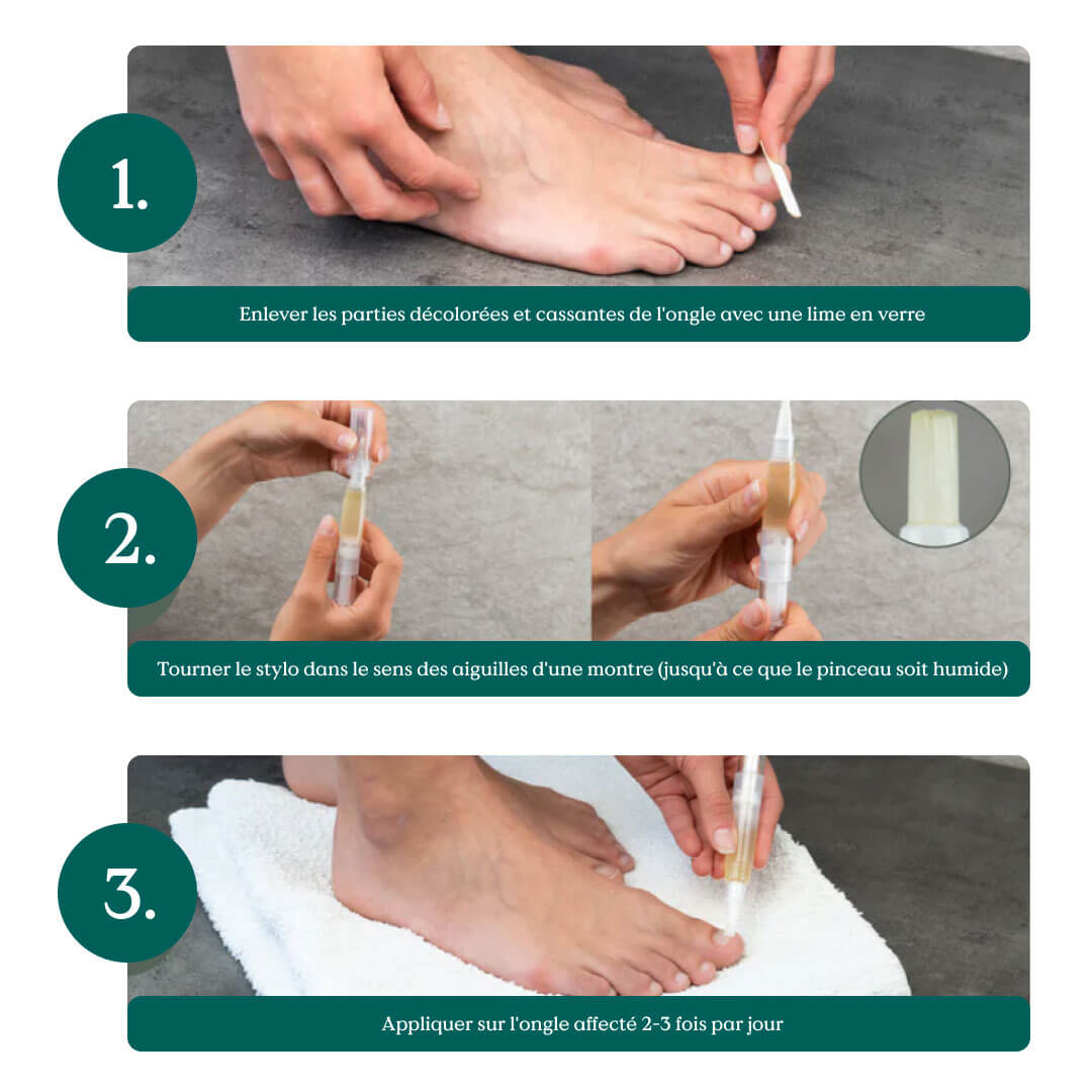 Je souffre de mycoses des ongles depuis environ 10 ans.Ces dernières années, j'ai essayé de nombreux produits en pharmacie ainsi que des médicaments prescrits par des médecins, mais aucun n'a réellement fonctionné. L'été dernier, j'ai découvert ce produit par hasard, et je dois avouer que j'étais assez sceptique au départ ; Après avoir lu de nombreux avis positifs et contacté le service client, j'ai repris espoir de m’en débarrasser une fois pour toutes. J'ai commencé à utiliser le stylo fin octobre, et je suis absolument ravie 🙂 Au bout de quatre semaines, j'ai vu de très bons résultats. L'ongle sain a commencé à bien repousser, et le champignon disparaissait chaque mois :) Je suis tellement satisfaite que j'ai déjà recommandé le stylo à ma famille. J'ai hâte de porter des sandales cet été, sans m'inquiéter de mes ongles !